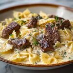 This Beef and Bowtie Pasta with Alfredo Sauce is a creamy and hearty dish combining savory ground beef with tender bowtie pasta in a rich homemade Alfredo sauce. Perfect for a comforting weeknight meal, it features a blend of garlic, Italian seasoning, and Parmesan cheese to create a deliciously creamy and flavorful pasta entree.