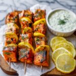This Garlic & Lemon Salmon Kabobs Recipe pairs beautifully with light, wholesome sides. Consider fluffy couscous, fragrant rice pilaf, or a crisp green salad drizzled with olive oil and balsamic vinegar. For an extra creamy touch, a dollop of homemade tzatziki or Greek yogurt sauce adds an enticing cooling contrast that rounds out the meal perfectly.