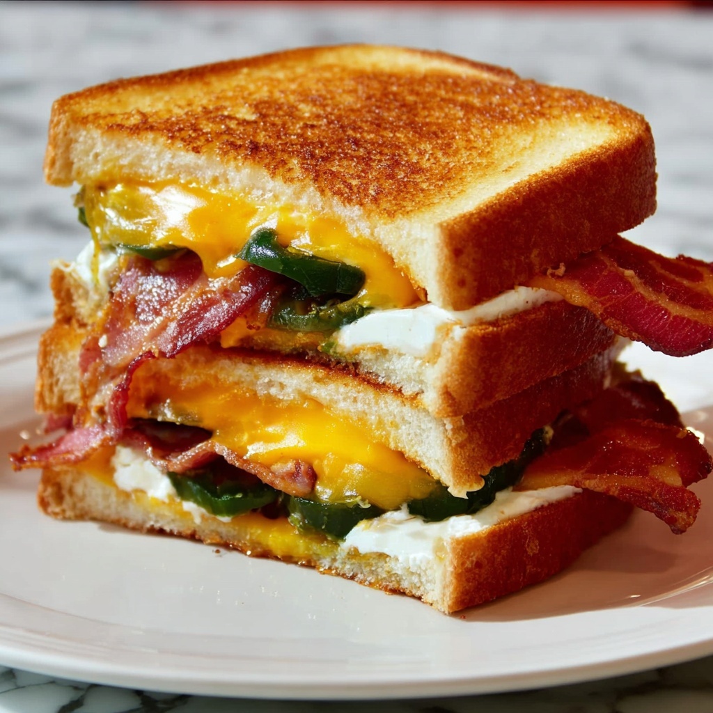 A delicious and spicy Jalapeno Popper Sandwich combining creamy stuffed jalapenos, crispy bacon, and melted cheeses grilled to perfection between buttery toasted Italian bread slices. This sandwich offers a perfect balance of heat, creaminess, and savory flavors for a satisfying meal.