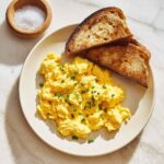 For a fun twist, serve your scrambled eggs on top of a warm English muffin or inside a halved avocado. Another idea is to spoon them onto a bed of fresh greens dressed lightly with lemon juice for a light yet delicious start to your day.