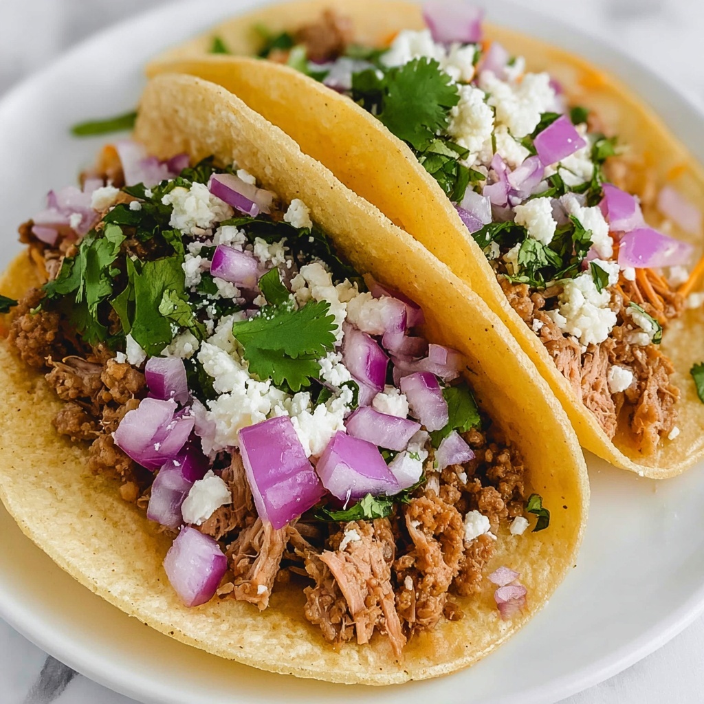 This Slow Cooker Shredded Beef Tacos recipe delivers tender, flavorful beef cooked to perfection in a salsa verde sauce. Using a beef chuck roast slow-cooked to fork-tender texture, this dish is perfect for easy weeknight dinners or casual gatherings. The beef is browned first for a depth of flavor, then slow-cooked with a savory mix of salsa, onions, garlic, and cumin. Serve the juicy shredded beef in warmed tortillas with your choice of fresh toppings like cilantro, cheese, avocado, and sour cream for a delicious Mexican-inspired meal.