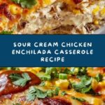 A comforting and cheesy Sour Cream Chicken Enchilada Casserole featuring layers of shredded chicken, tortillas, and a creamy sour cream enchilada sauce topped with melted cheddar and Monterey Jack cheeses. Perfect for a hearty family meal with optional garnishes to add fresh, tangy flavors.