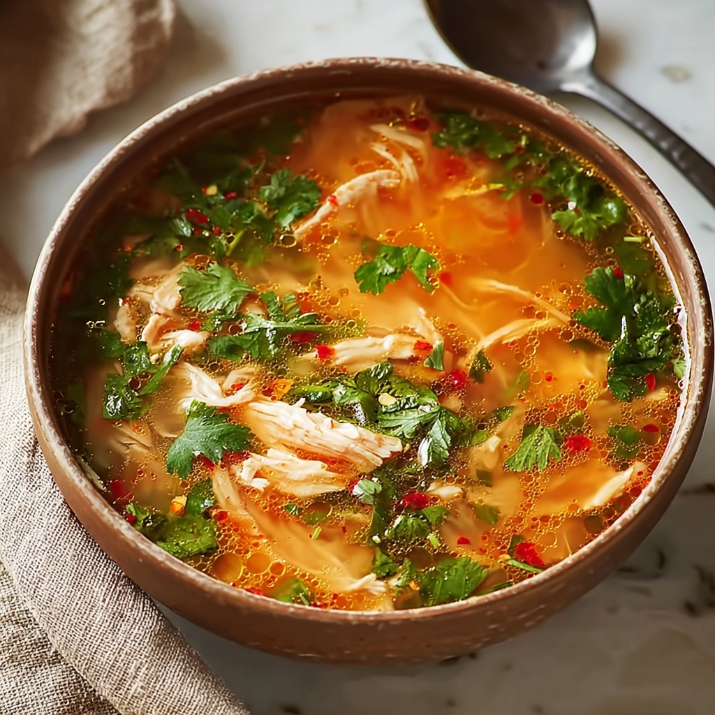 A flavorful and comforting Spicy Chicken Soup featuring tender shredded chicken, aromatic ginger and garlic, spicy green chili, and fresh cilantro, perfect for a quick and warming meal in just 30 minutes.