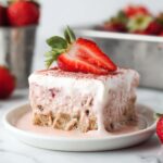 A luscious strawberry tres leches cake that is both eggless and dairy-free, perfect for those seeking a vegan-friendly dessert. This moist cake is infused with freeze-dried strawberries and vegan buttermilk, soaked in a creamy strawberry milk mixture, and topped with whipped coconut cream and fresh strawberries for a refreshing and indulgent treat.