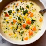 This creamy Zucchini Corn Chowder is a comforting and hearty soup packed with fresh vegetables and smoky bacon. Ideal for a cozy meal, it combines tender zucchini, sweet corn, and diced potatoes in a flavorful broth enriched with half and half. Finished with a hint of thyme and garnished with fresh parsley, this chowder offers a delicious balance of creamy texture and savory notes.